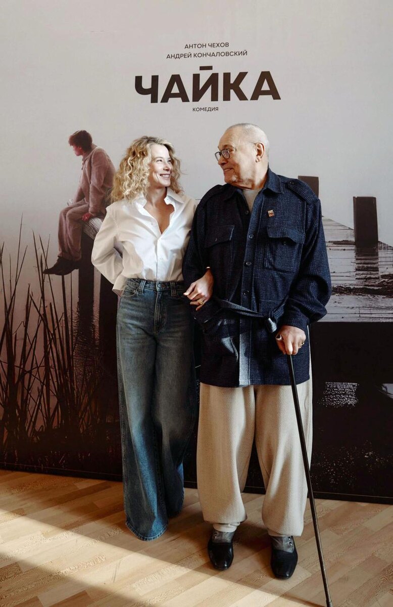 52-летняя Юлия Высоцкая и 88-летний Андрей Кончаловский вышли вместе в свет в Театре Моссовета