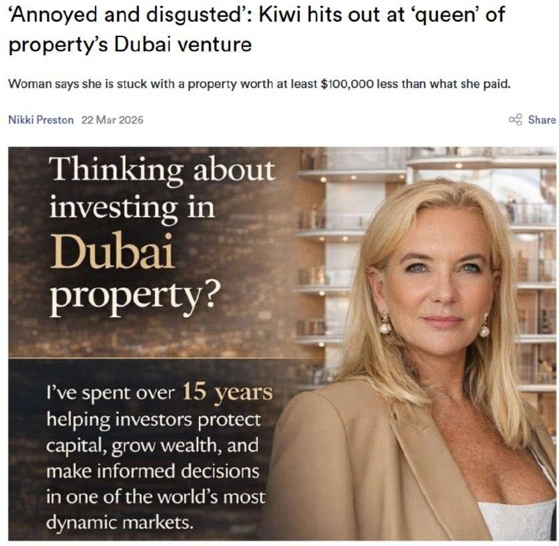 ?… Жительница Новой Зеландии пожаловалась на бывшую «королеву недвижимости» Никки Коннорс, которая предоставила вводящие в заблуждение финансовые советы по покупке недвижимости, из-за чего потеряла более 100 000 $ на инвестиции. Коннорс и её компания Propellor Property Investments были признаны виновными и обязаны выплатить компенсацию в размере 136 671$, однако средства до сих пор не поступили. Несмотря на это, Коннорс продолжает продвигать свои услуги по инвестициям в недвижимость за границей, включая Дубай, хотя в Новой Зеландии ей запрещено работать с клиентами. Финансовый регулятор страны предупреждает инвесторов о рисках сотрудничества с зарубежными брокерами, где местные защитные меры могут не действовать. 🔺Треугольный метр: На сайте | в MAX | Telegram | ВКонтакте | Дзен