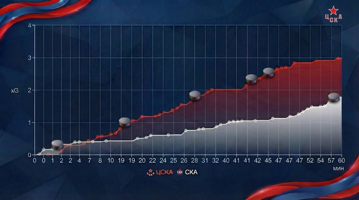Во втором матче серии ЦСКА стабильно начал превосходить соперника в опасности уже после восьмой минуты первого периода. Инициатива, по сравнению с первым матчем, оказалась еще более выраженной. И без того к количественным атакам добавили еще и качество, которое и выразили в четыре заброшенные шайбы. Отметим, что в обоих матчах в каждом периоде ЦСКА набирал не менее 0,9 хG.