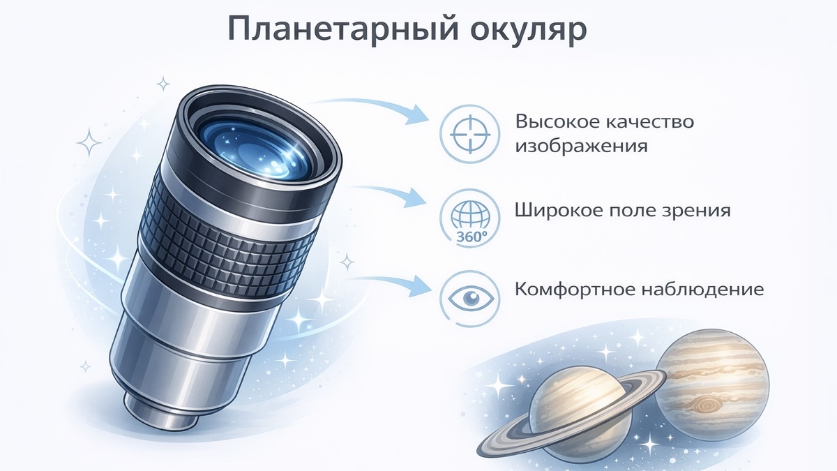 Планетарный окуляр — окуляр с короткофокусным расстоянием (2,5–12 мм), предназначенный для наблюдения планет, Луны и двойных звёзд при высоком увеличении телескопа. Такие окуляры обеспечивают резкое, высококонтрастное изображение с минимальными аберрациями в центре поля зрения. Среди популярных конструкций выделяют несколько типов. Ортоскопические окуляры (4-линзовая схема Аббе) дают превосходный контраст и резкость при умеренном поле зрения (~45°). Редсни и Монокентрики обеспечивают исключительное качество изображения в 2–6 мм. Серии Baader Hyperion Aspheric и Televue Nagler обладают широким полем (60–82°) с сохранением качества до краёв. TMB Planetary (теперь выпускается Baader) считается эталоном в классе бюджетных планетарных окуляров. Увеличение = Фокусное расстояние телескопа / Фокусное расстояние окуляра. Для телескопа Sky-Watcher 150/750 (ФР = 750 мм): окуляр 6 мм → 125×; окуляр 4 мм → 188×; окуляр 2,5 мм → 300×. Теоретический предел полезного увеличения ≈ 2× диаметр в мм = 300
