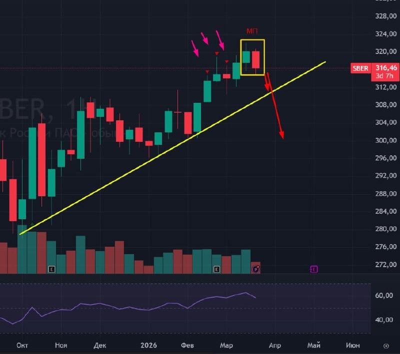 🏦 СБЕР 🟢 Недельный тайм-фрейм: 3 сигнала на продажу подряд! после чего вынос вверх с формированием медвежьего поглощения. Если недельную свечку не исправят. то это будет медвежьей формацией. 🟢 Дневной тайм-фрейм. Вчера писал о наличии крупного игрока в Лукойле и в Сбере. Подозреваю, что идет разгрузка в рынок. Тут три медвежьих поглощения + сигнал на продажу + дивергенция. Сбер - форвард нашего рынка. Такой график пока что меня останавливает от активной покупки нашего рынка. 🚗 Жду Сбер на уровни 310 и 300. Дальше уже нужно будет смотреть за ситуаций в динамике. Выглядит это всё тревожненько. #сбербанк #sber #sbrf #sberf #сбер #bogdanoffinvest $SBER $SRM6 $SRU6 $SBERF