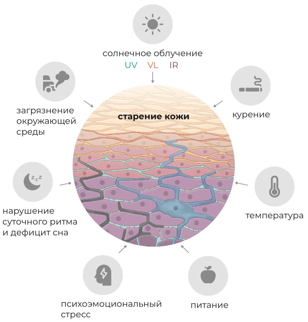 В 2005 году американским врачом-онкологом К. Вайлдом был предложен термин «экспосом/exposome», обозначающий совокупность негенетических факторов, воздействующих на здоровье человека. Так вышло, что применительно к проблеме старения кожи экспосом начали рассматривать только спустя одиннадцать лет. Довольно странно, учитывая тот факт, что кожа – первый барьерный орган тела. В научной сфере сегодня концепция экспосома является одной из важнейших для понимания здоровья кожи, наряду с геномом и микробиомом. • UV и инфракрасное излучение • Токсины окружающей среды (твердофазные частицы и полиароматические углеводороды, свинец, выхлопные газы, оксид азота, оксид серы, озон на уровне земли, сигаретный дым) • Несбалансированное питание, богатое сахарами, простыми углеводами и животными жирами. Употребление алкоголя и наркотических веществ • Стресс. Влияет на проницаемость защитного барьера, снижение иммунных функций кожи, уровня репарации ДНК и антиоксидантной защиты • Нарушения сна и цирк