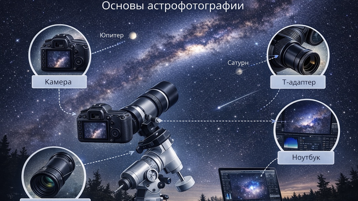 Астрофотография — съёмка небесных объектов с помощью камеры, подключённой к телескопу или установленной на монтировке. В отличие от визуальных наблюдений, фотографии позволяют запечатлеть объекты, слишком слабые для невооружённого глаза, и накапливать свет за счёт длинных экспозиций. Пейзажная астрофотография (звёздное небо, Млечный Путь) не требует телескопа — достаточно зеркальной или беззеркальной камеры и штатива. Лунная и планетная съёмка («high-speed» видео с последующим стекингом кадров) выполняется через телескоп с монокулярной камерой или смартфоном. Deep-sky фотография (туманности, галактики, скопления) требует монтировки с ведением, подходящего телескопа и желательно охлаждаемой астро-камеры или модифицированной DSLR. Для начала астрофотографии потребуется: монтировка с электроведением (например, Sky-Watcher EQ3-2 с мотором или AZ-GTi), телескоп-рефрактор 60–80 мм ED (Sky-Watcher Evostar 80ED) или рефлектор 150 мм f/5, зеркальная камера (Canon EOS 550D и выше, или астрокамер