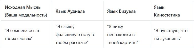 Инструментарий перевода: Если вы слышите, что собеседник живёт в одной модальности, ваша задача — перевести свою мысль на его язык, используя его же маркеры.