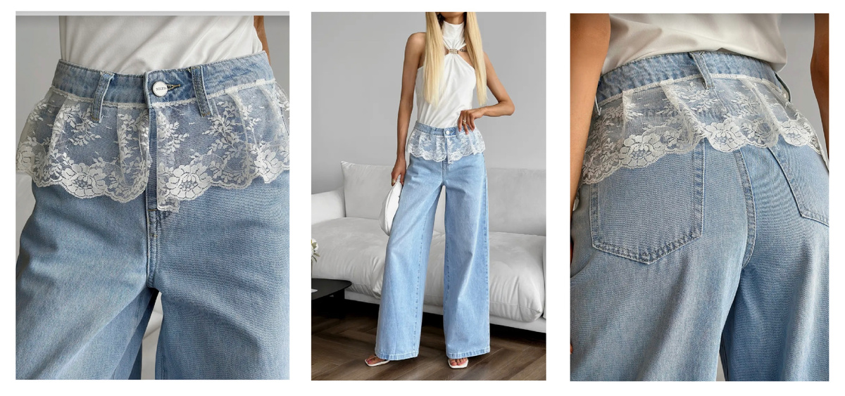 В сезоне весна–лето 2026 деним окончательно перестаёт быть просто базой и всё чаще превращается в главный акцент образа, при этом мода уходит не в сторону хаотичного декора, а в сторону точечных деталей, которые меняют восприятие всей вещи, именно поэтому запросы «модные джинсы 2026», «джинсы с акцентом на талии», «женственный деним», «необычные джинсы с чем носить» сейчас особенно актуальны. Именно в этом контексте джинсы палаццо с кружевом выглядят не как случайный эксперимент, а как очень точное попадание в новую волну моды, где сочетаются женственность, расслабленный силуэт, визуальная коррекция фигуры и тренд на сложную романтичную базу. Палаццо джинсы с кружевом — это пример того, как одна деталь может полностью изменить восприятие денима, здесь работает сразу несколько сильных модных приёмов, широкий крой палаццо, высокая визуальная вертикаль, мягкий светлый деним и кружевной акцент в верхней части, за счёт чего вещь в