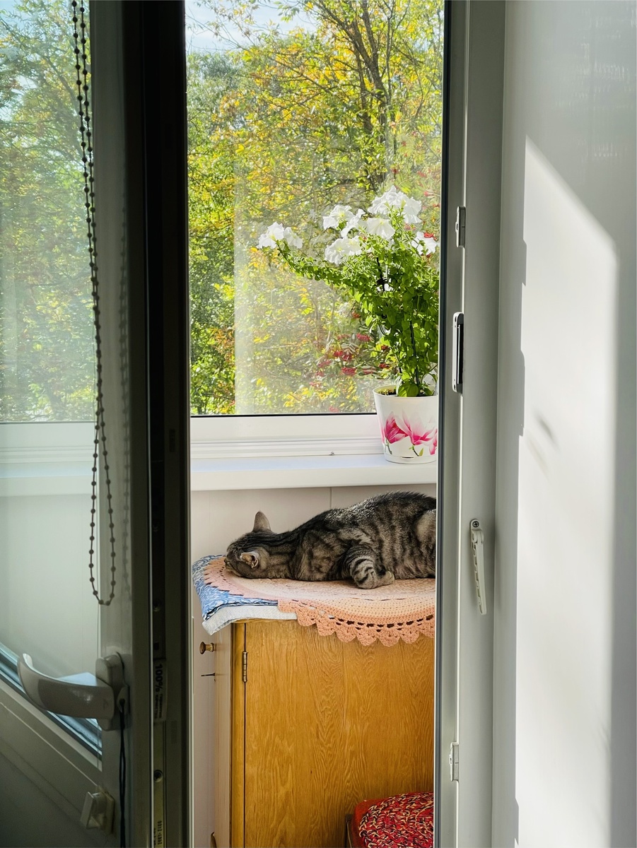 12 сентября 2025 года. Ричард спит на балконе. Днём там тепло, воздух нагревается и спать там здорово.