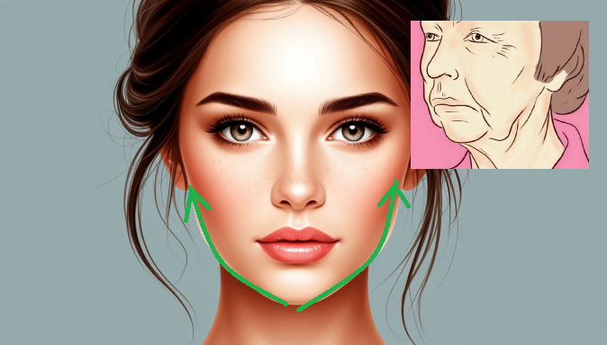 Вместе с оплывшим овалом лица появляются носогубные складки, брыли, отёки, уходит угол молодости ( угол от мочки уха до овала лица ).