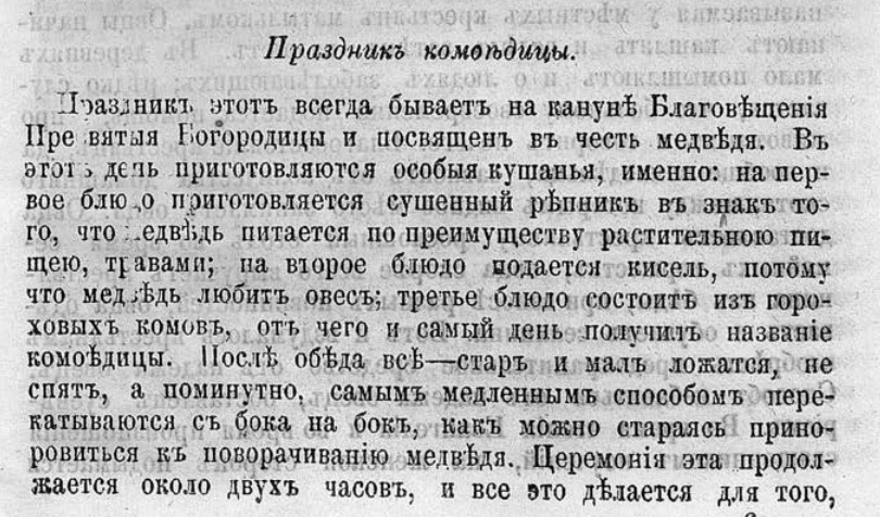Тут нас плавно перекидывает с масленичной недели на праздник Комоедица (бел. Камаедзіца), который некоторые одарённые люди приурочивают то к Масленице, то к весеннему равноденствию. Тем временем, это совершенно самостоятельный локальный праздник весеннего цикла. Есть такое мнение, что «комы» - это медведи либо предки, которым отдавался первый блин, вот отсюда и название. У всех славян особая роль отводилась первым дарам: первому куску еды, ложке из общего блюда, блину, плоду нового урожая или глотку напитка - их традиционно выделяли как жертвенную долю предкам.