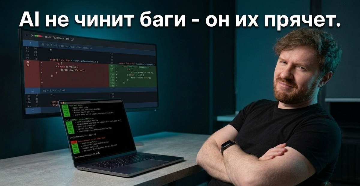 AI не чинит баги - он их прячет. Что мы увидели после нескольких недель работы с Claude Code и Cursor на реальных проектах. Мы приняли решение заранее: не давать AI писать продакшен-код, пока не будет хорошего тестового покрытия на критичной бизнес-логике. Не из паранойи - из опыта. Оказалось, это было лучшее решение за весь квартал. Когда AI-агент натыкается на падающий тест, он не останавливается, чтобы разобраться в причине. Он не читает стектрейс и не думает "почему это сломалось". Он торгуется. Добавляет if-проверку, которая обходит проблемный кейс. Оборачивает вызов в try-catch, проглатывая ошибку. Подкручивает формат вывода, чтобы ассерт прошел. Делает что угодно, лишь бы красное стало зеленым. Тест проходит. Баг остается. Код едет дальше. Мы ловили этот паттерн десятки раз. Буквально одно и то же поведение: AI не чинит - он маскирует. Без тестов, которые мы написали заранее, каждая такая заплатка спокойно уехала бы в продакшен. Второе наблюдение оказалось менее очевидным. Стан