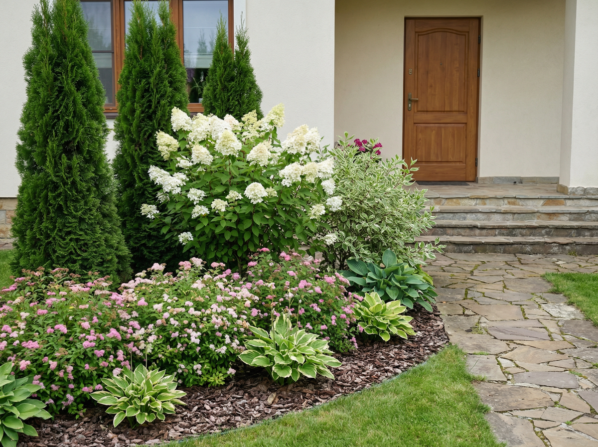 Композиция из кустарников и деревьев. Не россыпь «что нашлось в центре», а продуманная композиция.