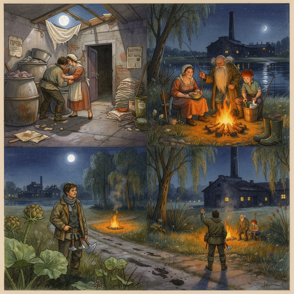 У костра сидели двое. Один - старик с бородой, такой длинной, что он несколько раз наматывал её на руку, чтобы она не волочилась по земле. Второй - парень лет двадцати, с лицом, покрытым веснушками и такой рыжей шевелюрой, что казалось, голова у него горит в отблесках костра. Оба были в засаленных куртках, в резиновых сапогах и с таким видом, будто просидели на этом месте не один час, а все последние лет пять.