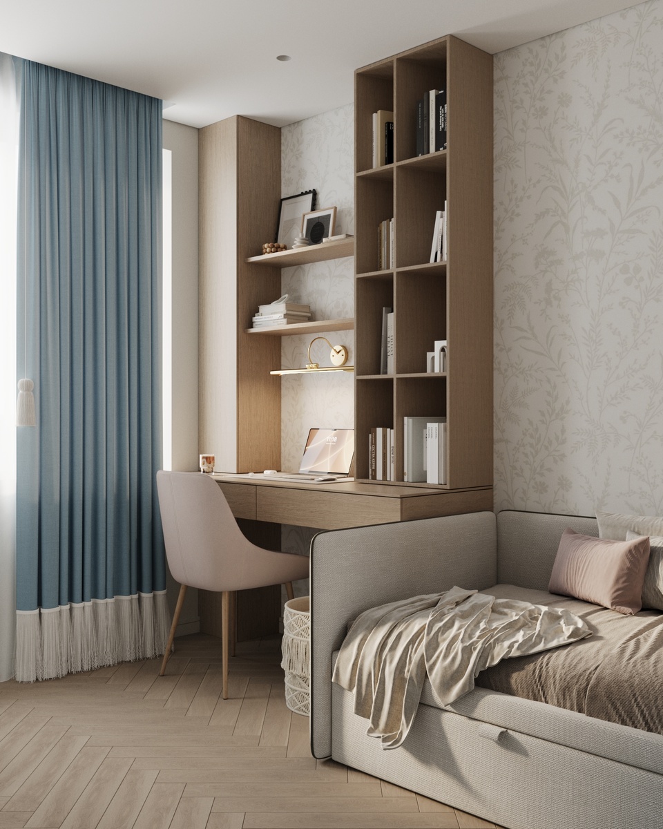 1️⃣ Свет. Мы использовали теплый голубой. В отличие от серого или темно-синего, он не «съедает» естественное освещение. Даже если окна выходят на северную сторону, комната будет выглядеть светлой и солнечной.