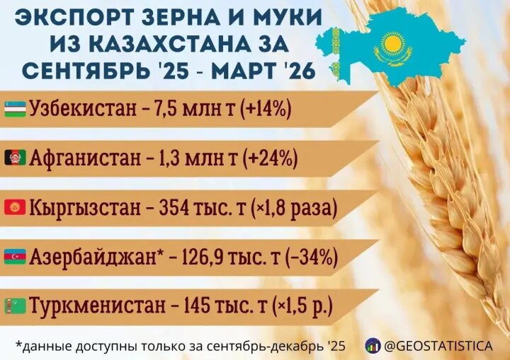 Согласно приведенной информации, крупнейшим импортером казахстанского зерна и муки по-прежнему остается Узбекистан. Объем поставок в узбекском направлении увеличился на 14 процентов - с 6,6 млн до 7,5 млн тонн. Это означает, что основная часть экспортного прироста пришлась именно на рынок Узбекистана, который сохраняет ключевое значение для внешних поставок казахстанской зерновой продукции.