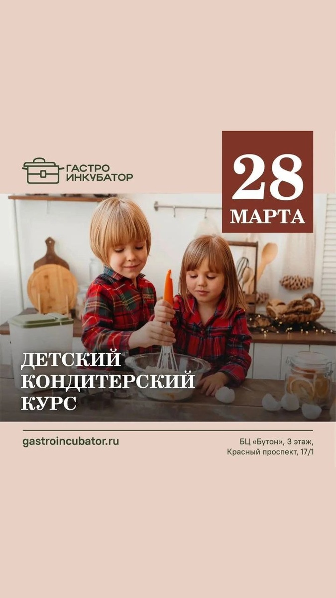 ! Успевайте записаться! Детский кондитерский курс - как стать вкусных дел мастером с юных лет. Если ваш ребёнок мечтает стать шеф-кондитером и уже практикуется на домашний кухне, а вы готовы вкладываться в его развитие, то наш курс может вам в этом помочь! 28 марта старт курса «Детский кондитерский» 🥧Изучаемые темы: 1. Песочное тесто. 2. Бисквитное тесто. 3. Кексовое тесто. 4. Белковое тесто и конфеты. 5. Медовое тесто. 6. Роспись имбирных пряников. 7. Тесто слоёное. 8. Приготовление кей-попсов. 9. Домашнее печенье. Продолжительность обучения – 10 недель. В программе 10 занятий. Форма обучения - очная, практика. По завершению цикла выдаётся именной сертификат. Стоимость обучения: 20 000 руб. ❓Кому отправить программу пишите или звоните ⤵️ ☎️ + 7 913 916 98 82 Сайт: gastroincubator.ru Telegram: https://dzen.ru/id/6228dbfbab075610706c2122 ВК: https://vk.com/gastro_incubator