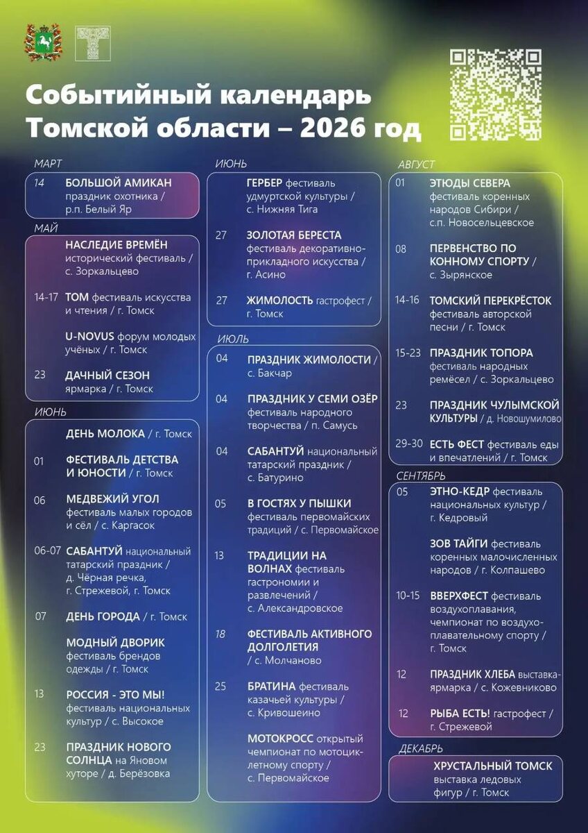— и он готовит вам десятки поводов выйти из дома, зарядиться эмоциями и влюбиться в регион заново. Фестивали, которые взрывают красками. Концерты, от которых захватывает дух. Ярмарки, где хочется купить всё. Спортивные вызовы, которые проверяют на прочность. Традиции, которые трогают до глубины души. Неважно, любите ли вы: 🔸танцевать до упаду или спокойно 🔸любоваться закатом над рекой; 🔸пробовать новые вкусы или вспоминать забытые рецепты; 🔸покорять высоты или открывать тайны старинных улочек. в Томской области 2026‑го найдётся событие именно для вас. Собирайте друзей, планируйте маршруты и готовьтесь к приключениям! Где встретимся в новом сезоне? 🔥