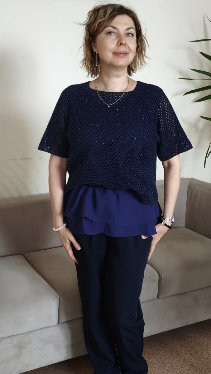 Футболку крючком вязала из двух нитей: тонкий хлопок плюс мини-пайетки на хлопке. При вязании из хлопка надо выбирать такой номер крючка, чтоб полотно оставалось пластичным и не стояло колом, желательно вязать образец, пробуя разные номера.