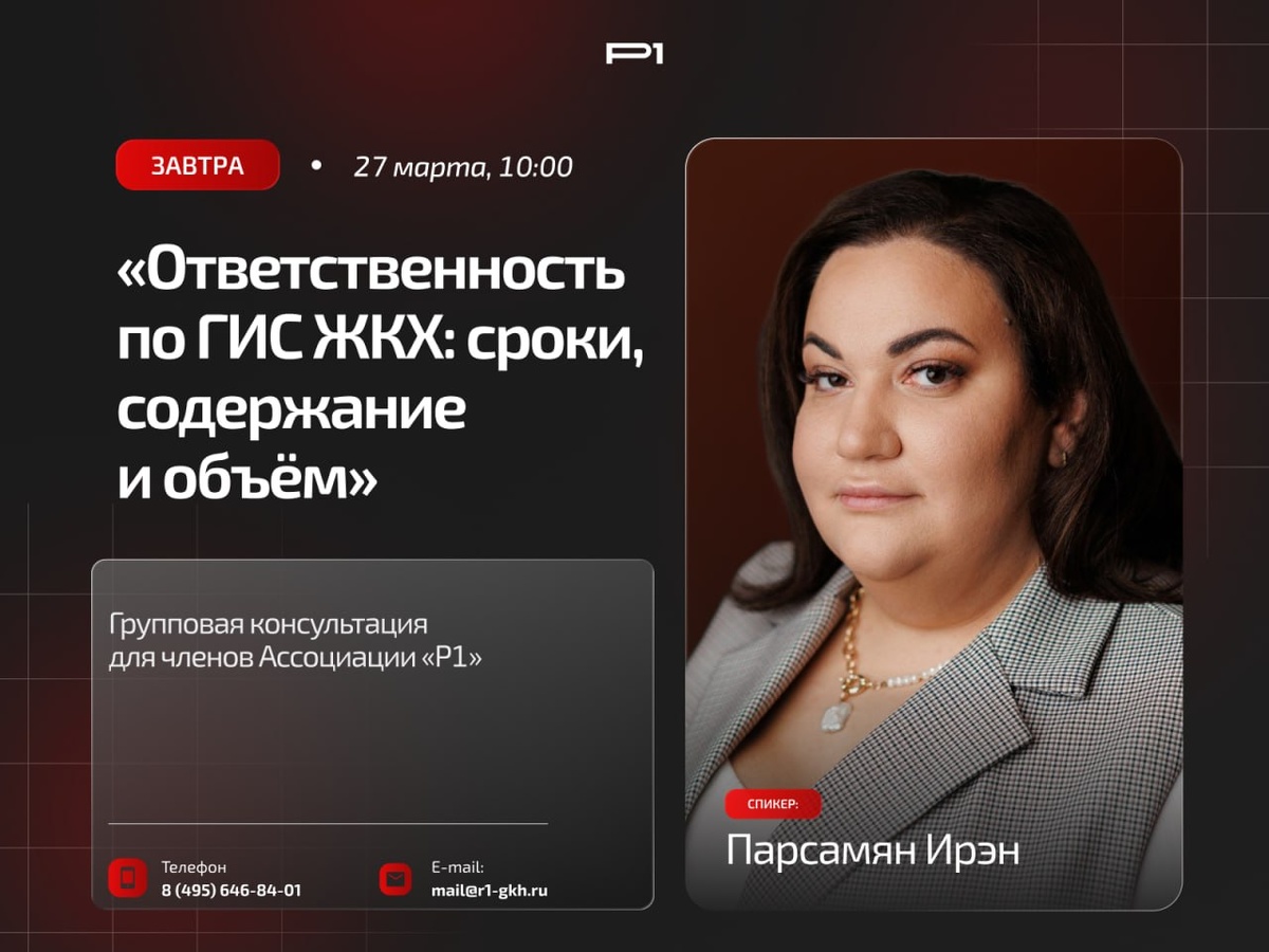 ➡️ Уже завтра, 27 марта с 10:00 до 12:00 в новом формате групповых онлайн-консультаций для членов Ассоциации «Р1». 🔚 Тема месяца: «Ответственность по ГИС ЖКХ: сроки, содержание и объём» с Ирэн Парсамян. ✅ Обсудим: ▪️ основания ответственности и судебную практику ▪️ типовые ошибки при размещении информации ▪️ синхронизацию ГИС ЖКХ с реальными документами ▪️ персональную ответственность руководителя ▪️ новый регламент по размещению информации в ГИС ЖКХ от Ассоциации «Р1» ❤️ Формат доступен только для членов Ассоциации «Р1». Ссылку доступа опубликуем в закрытом чате членов.