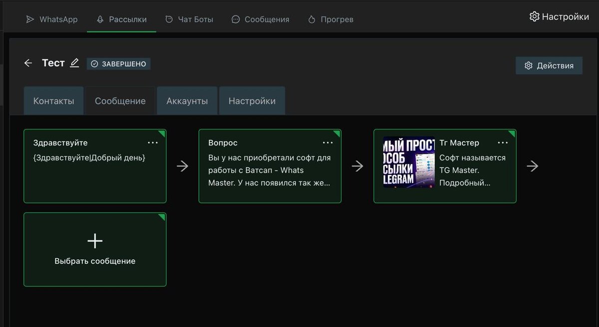Добавлено: 1. Возможность добавлять SOCKS5 прокси по мимо HTTP в индивидуальных настройках аккаунта. Отличные стабильные прокси можно взять https://sx.org/?c=o9cGlk А по промокоду: WAPRO можете получить +3GB трафика 2. Новая логика выбора сообщений при создании рассылки. Сейчас все выбранные сообщения и их последовательность будет видна сразу. 3. В настройках рассылки можно выбрать последовательность отправки сообщений • Без паузы - отправка сразу же • С заданнаой паузой - будут уходить с задержкой относительно друг друга • После ответа пользователя - каждое следующее сообщение будет уходить после любого ответа получателя сообщений. Автоворонка на минималках )) Исправления: 1. Исправлена работа ИИ бота. Не срабатывали Стоп и Старт слово. 2. Исправлена цветовая гамма и несколько улучшений дизайна Скачать обновленную версию можно по ссылке https://whatsmaster.ru/#download Или при перезапуске программы.