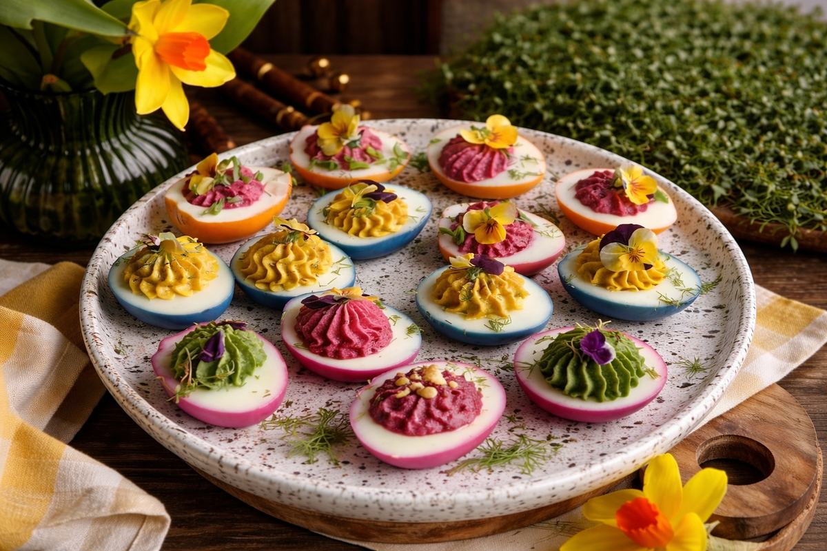 Я очень люблю такие рецепты к Пасхе, где всё складывается сразу: и красиво, и вкусно, и хочется поставить в центр стола, а не спрятать где-то между салатами. Вот эти цветные яйца как раз такие. Мне особенно нравится, что в этом рецепте нет тяжёлой нарочитости. Здесь всё строится на простых вещах: яйца, натуральные красители, три пасты разного цвета и немного красивой подачи. А эффект — как будто вы готовили что-то намного сложнее. Вкус: