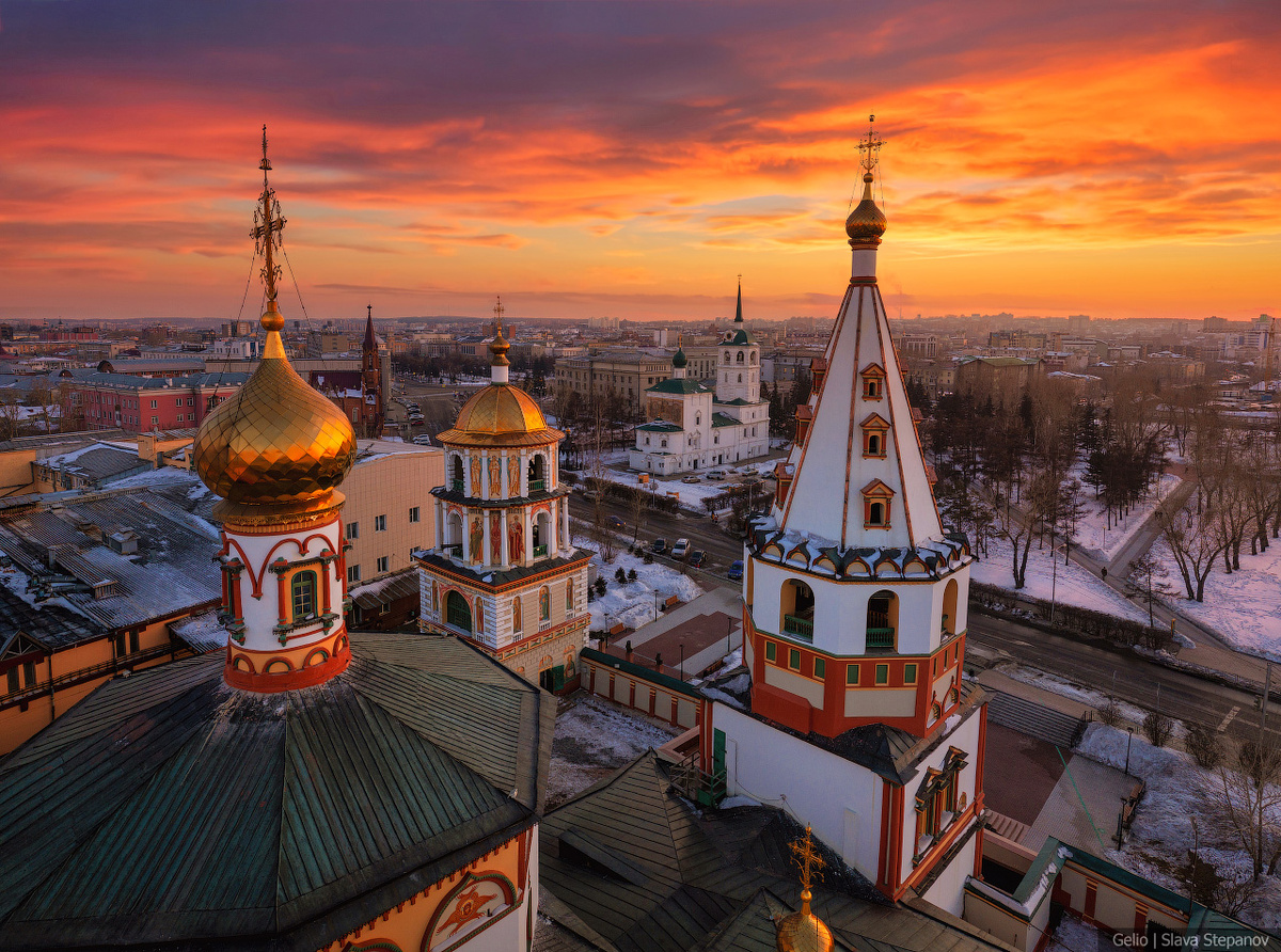 Город разделён на две части Ангарой — единственной рекой, вытекающей из Байкала, самого глубокого озера мира. Иркутск начался с небольшого острога, построенного казаками в 1661 году — сейчас от этой крепости сохранилась только Спасская церковь. Долгое время Иркутск оставался городом купцов и золотопромышленников. Сегодня это один из крупнейших городов Сибири с населением более 600 тысяч человек. В историческом центре сохранилась застройка конца XIX — начала XX века: храмы, купеческие каменные дома и деревянное зодчество. 1. Глазковский автомобильный мост – одна из автомобильных переправ через Ангару. 2. Центр Иркутска. 3. Острог построил в 1661 году отряд землепроходца Якова Похабова по приказу Енисейского воеводы. Сам Яков в конце того же года вернулся в Енисейск — и больше упоминаний о нём не было. А в 2011 в Иркутске ему установили памятник — как основателю города. 4. Спасская церковь — единственная в Сибири, на внешних стенах которой имеются росписи начала XIX века. Их уникальность