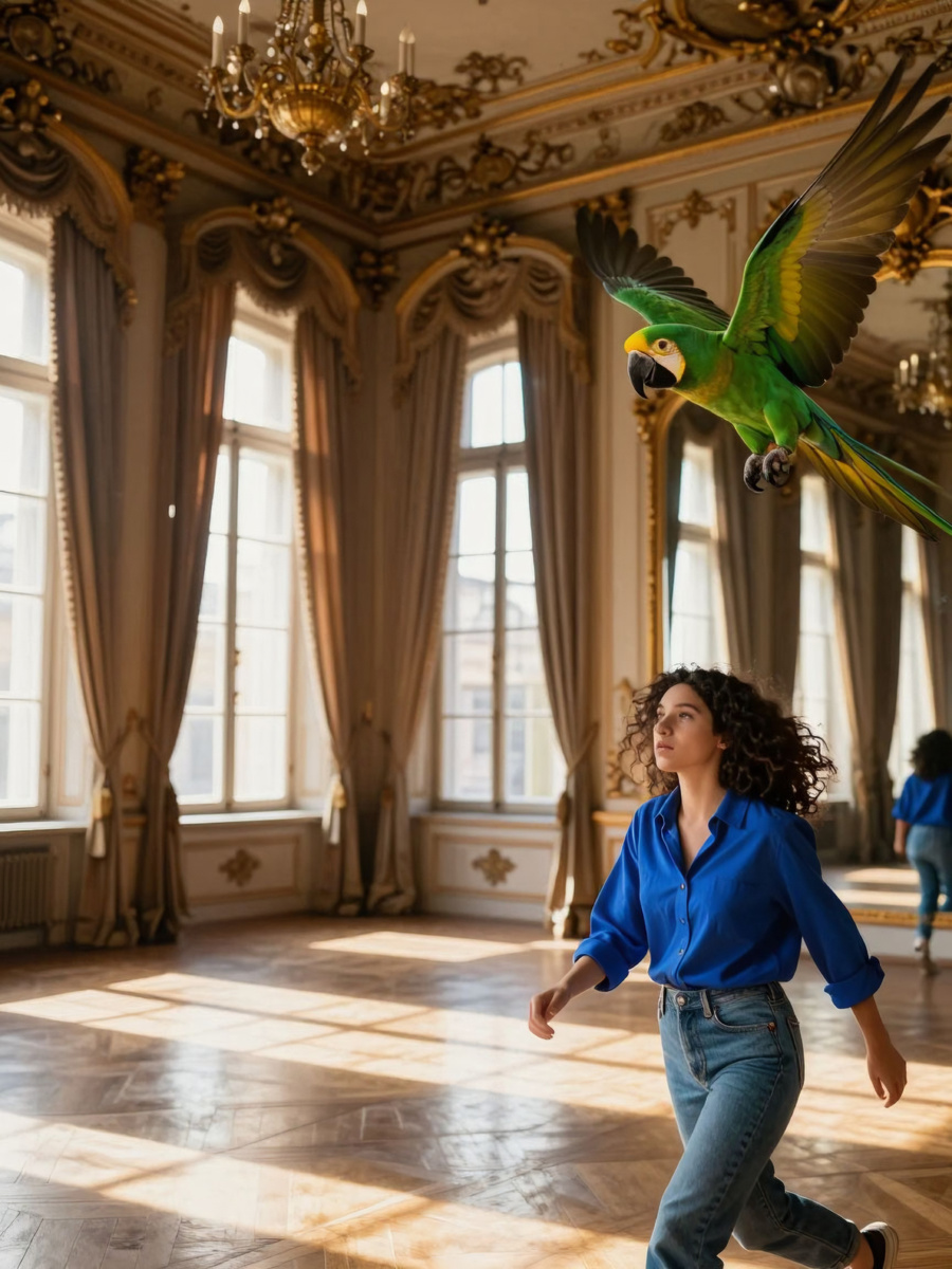 Попугай медленно переступил лапками, выбрался на край клетки, огляделся… Потом вдруг захлопал крыльями, сорвался и полетел. Описал круг под высоким потолком, врезался в люстру, заставив её мелко зазвенеть, пронёсся к окну, развернулся и сел на карниз. Секунда - и снова в воздух, на этот раз прямо в зеркало. Он ударился в стекло, отлетел, снова врезался.