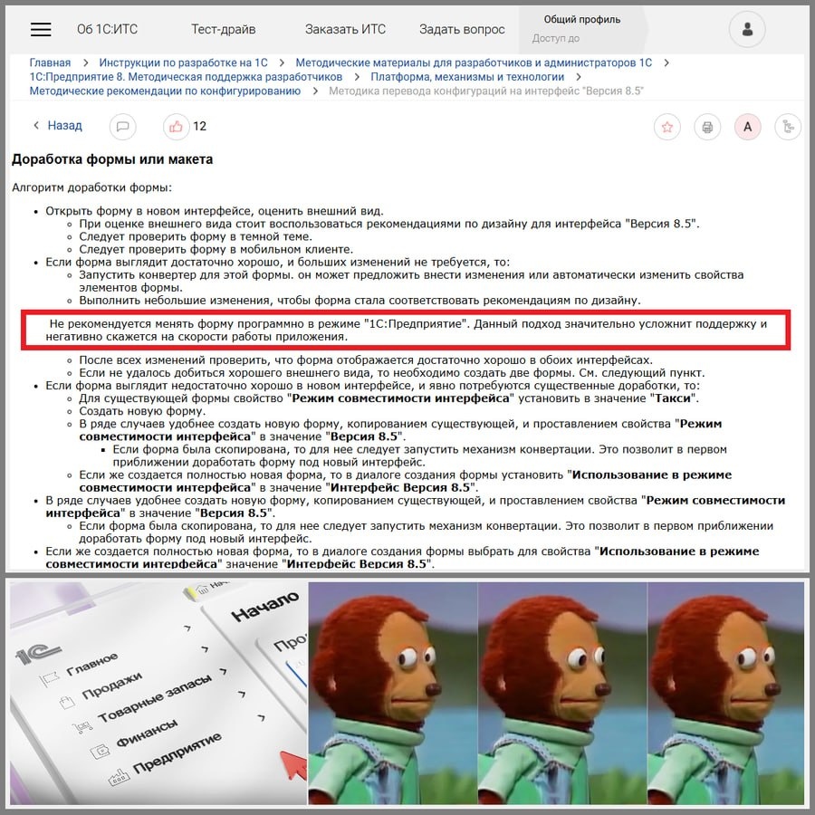 В свежих методических рекомендациях 1С есть важное указание: Не рекомендуется менять форму программно в режиме 1С:Предприятие. Данный подход значительно усложнит поддержку и негативно скажется на скорости работы приложения. Программную работу с формами используют многие. Я и сам часто использую код для работы с визуальной средой. Хотя других легальных механизмов для динамического изменения интерфейса, которые не приведут к некорректному отображению в конфигураторе достаточно. Каких-то явных визуальных проблем с такими конструкциями кода, где встречаются Элементы и РеквизитыФормы при пробном переводе интерфейса нетиповой конфы на 8.5 я не заметил (может недостаточно тестировал). В любом случае, впредь программно форму лучше не менять, чтобы не получить артефактов. #Практика1С #Релиз8_5наПроде