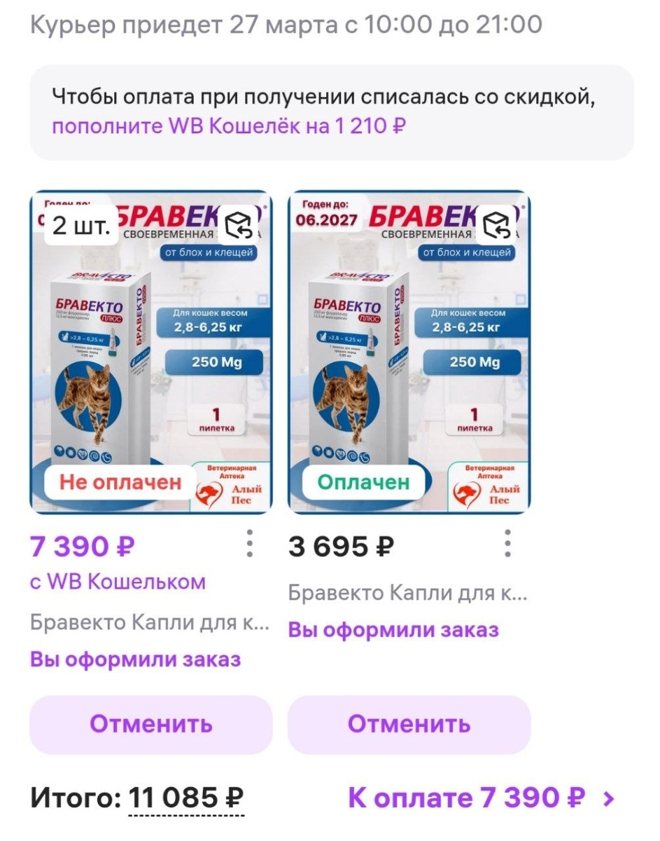 Заказала Бравекто, оплачено только 1 пипетка из трех На ВБ у меня нет дооговой карты, нужно оплачивать по факту Нужно собрать 7390 Без бравнкто никак Это много лучше всех этих других капель Защита от клещей на 3 месяца! Капли типа тоже защищают, типа на 3 месяца от блох и месяц от клещей. Ключевое - типа. Гарантированно от клещей дает защиту только Бравекто (симпарики и несгарда для кошек не видела) И на 3 мес (почти на 3) Но по 3000 на 10 активно гуляющих котиков нет. На 30 ткм более. Поэтому выкупаю бравекто сколько могу по минимуму: двух обработала, три пипетки едут Остальное капли подешевле. Спасибо всем, кто помогает Сейчас вот долги у меня опять выросли Корма собачьи на исходе Бравекто и дажн просто дешевых капель на трех собак тоже нет. Тоже надо покупать. Хотя бы Барс