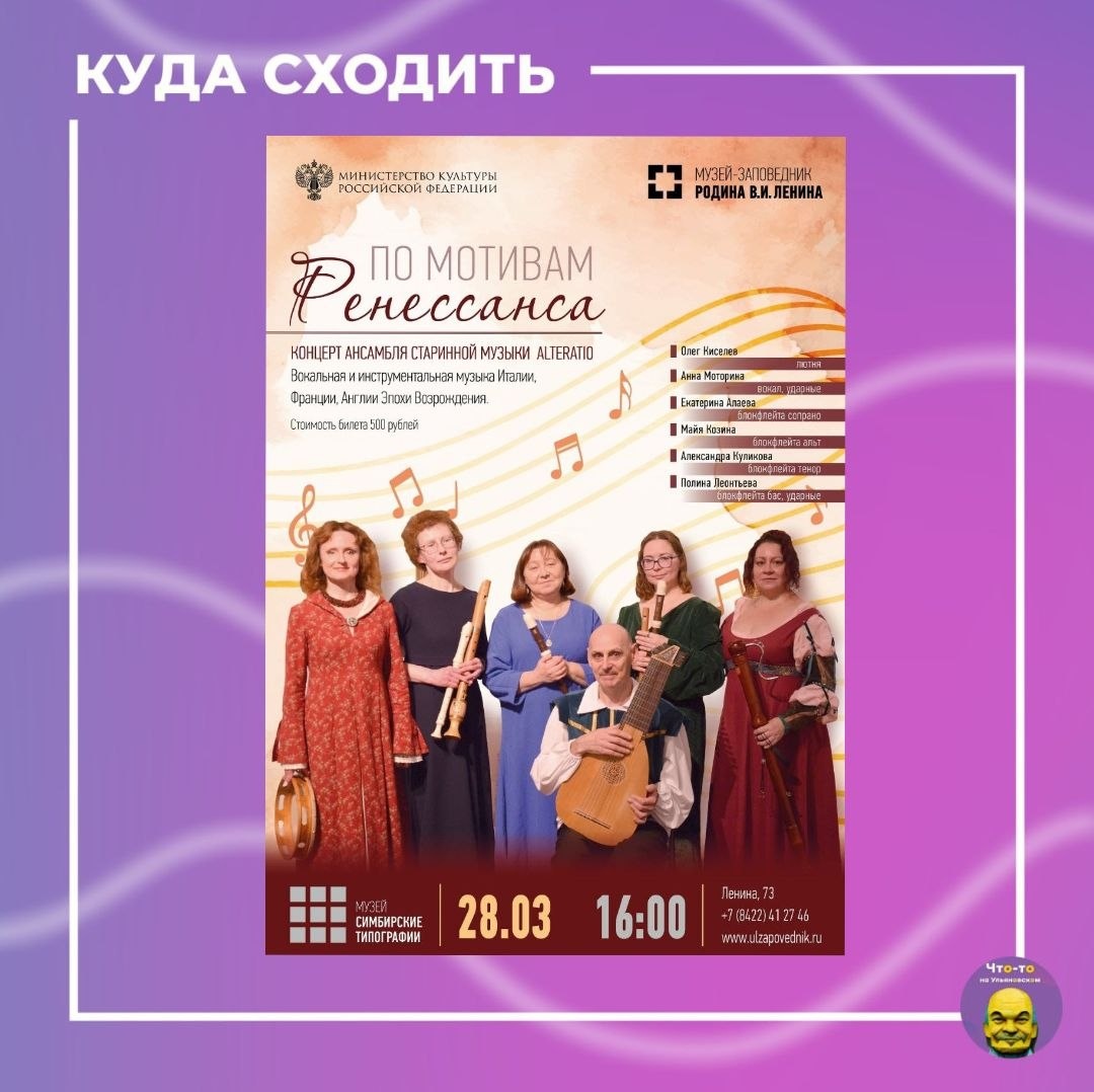 " 🎼 Вы услышите, как звучит консорт блокфлейт в сопровождении лютни и прекрасные мелодии, которым более 500 лет. Эта чудесная и необычная музыка позволит вам перенестись в ту далёкую эпоху, когда творили великие художники, поэты и музыканты. Будем искренне рады видеть вас на концерте и надеемся, что увлекательное путешествие «По мотивам ренессанса» будет интересным и вдохновляющим. 📅Когда: 28 марта в 16:00 📍Где: Музей "Симбирские типографии" (ул. Ленина 73) #куда_пойти_ул