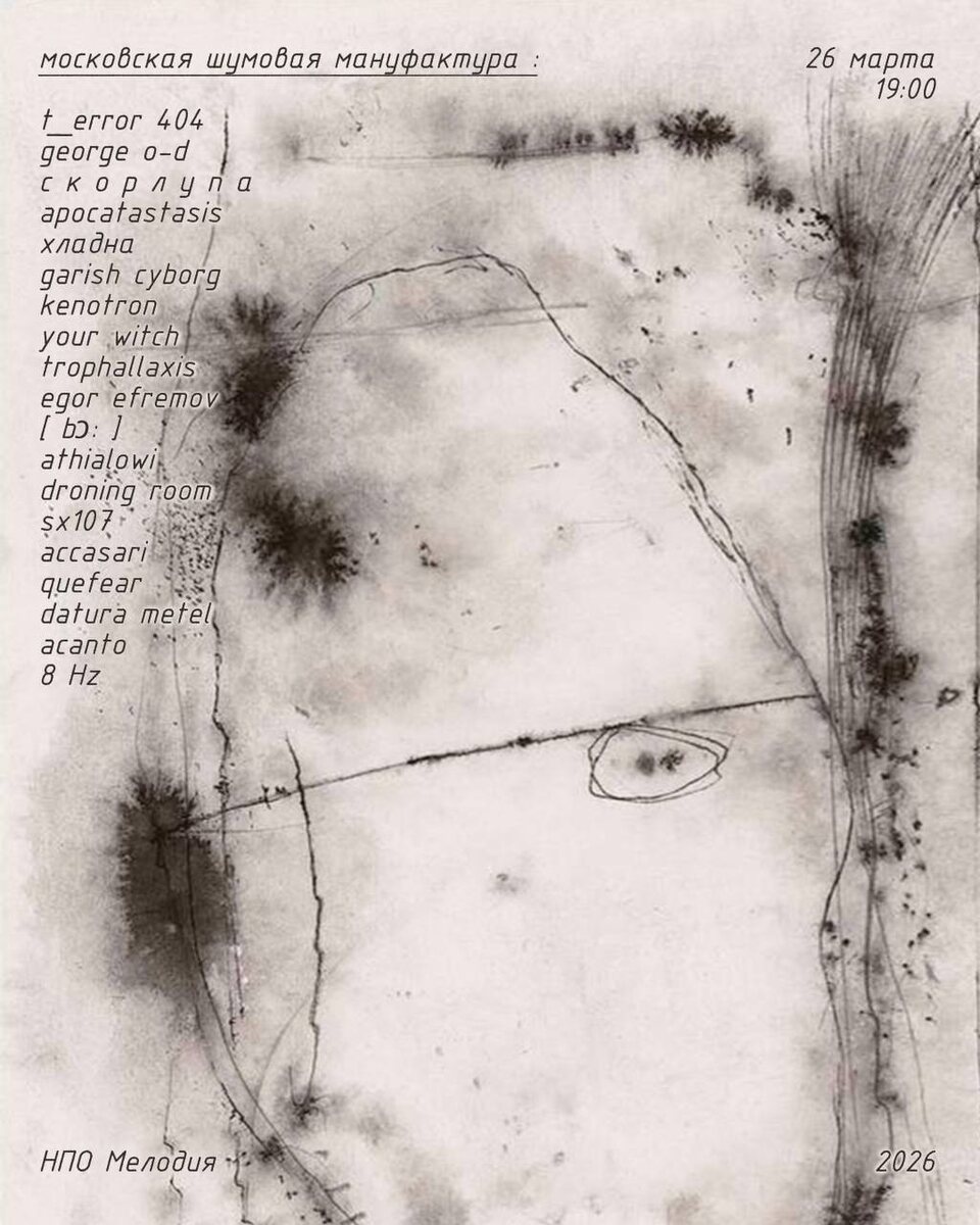 26 марта в НПО Мелодия На этот раз программа получилась очень разной по форме и настроению: сольные перформансы, выступления сайд-проектов МШМ, шумовые коллаборации внутри сообщества и общий оркестровый сет в финале вечера. Только лайвы. t_error 404 george o-d apocatastasis хладна garish cyborg kenotron your witch trophallaxis egor efremov с к о р л у п а [ bɔ: ] athialowi droning room sx107 accasari quefear datura metel acanto 8 Hz 🎫 Билеты 📆 26 марта, в 19:00 📍 нпо Мелодия, Москва, 3-я ул. Ямского Поля, 2, корп. 5