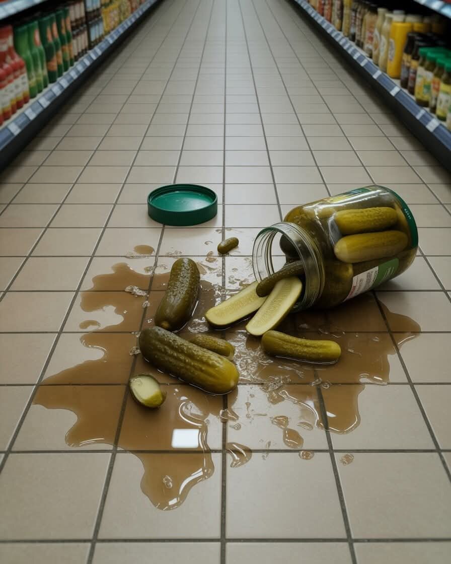 Сегодня в супермаркете я увидел сцену, которая до сих пор стоит перед глазами. Пожилой мужчина — лет восьмидесяти — случайно разбил банку с огурцами. Раздался шум, люди обернулись.