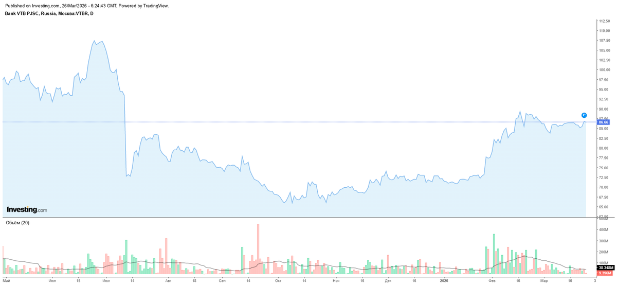 На момент анализа акции ВТБ торгуются по 86,69 рубля. За день цена изменилась на минус 0,10 процента. Диапазон дня составил 86,55 – 87,28 рубля. Объем торгов — 9,66 млн акций. Диапазон 52 недель: 64,87 – 109,04 рубля.