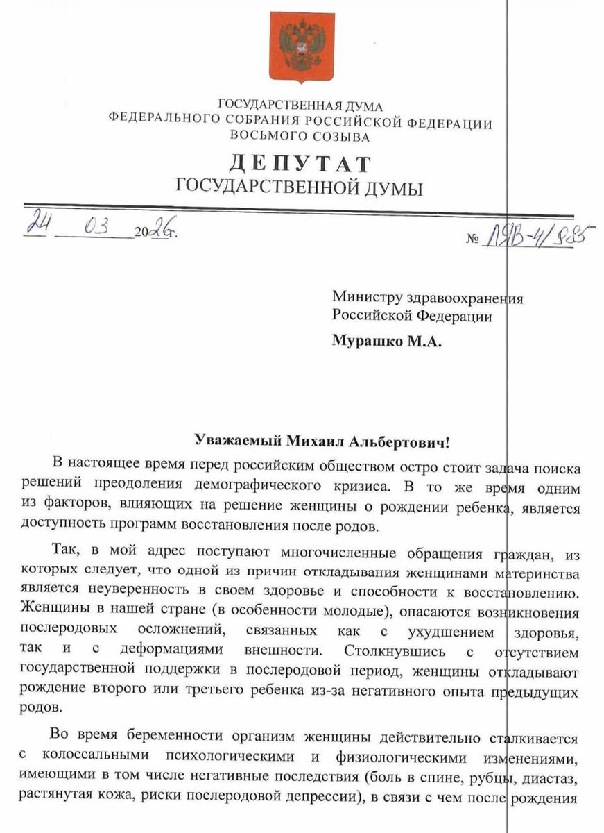 📩Направила такое обращение на имя министра здравоохранения РФ Михаила Мурашко. 🆗В программу послеродовой реабилитации можно включить наблюдение у гинеколога, терапевта, эндокринолога, диетолога и других специалистов. Также нужна психологическая поддержка, минимизирующая риски развития послеродовой депрессии, и физиотерапевтические процедуры. Кроме того, женщина должна быть обеспечена комплексом витаминов и минералов бесплатно. А в случае доказанной эффективности и безопасности, должна иметь возможность получить эстетическое восстановление. 🤰Во время беременности организм женщины сталкивается с колоссальными психологическими и физиологическими изменениями, имеющими в том числе негативные последствия. Ко мне поступают обращения граждан, из которых следует, что одной из причин откладывания женщинами материнства является неуверенность в своем здоровье и способности к восстановлению.☝️☝️☝️ Частные клиники предоставляют широкий перечень услуг по программам реабилитации после родов. Сто