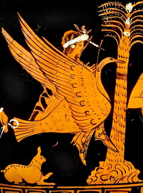 В ряду многочисленных живых атрибутов Аполлона лебедь по праву занимает главное место. Популярность мотива «Аполлон и лебеди» засвидетельствована на протяжении всей античности. Эта красивая гордая птица сопровождает божественных близнецов Аполлона и Артемиду «самых прелестных меж славных потомков Урана» (Hes. Theog., 920). Иногда на лебеде (а чаще на гусе, судя по вазописи) появляется «золотая Афродита» или ее сорванец Эрот (но это уже поздний эллинизм). Возможно, здесь термин укрывать, укрытие, крыло.
