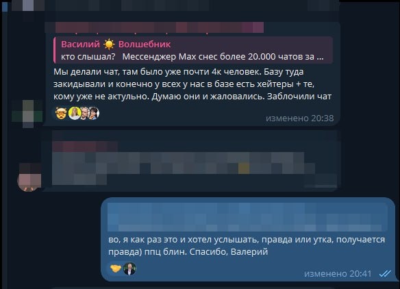 🤣 Это безобидные чаты людей - барахолки, товары, общение, т.е. сносят не мошенников или русофобские каналы Снесли чаты и шлёт кучу уведомлений о блoкировке (всем участникам чатов) Я общаюсь с профильными закупщиками рекламы и все в гневе Также невозможно общаться в мессенджере Пример: салон красоты перевёл клиентов в МАХ Двое пожаловались на сообщения салона (цена не устроила) и аккаунт салона заблокировали. ИТОГ - в МАХе невозможно вести бизнес и переводить туда клиентов 😡😡😡 из-за блокировки аккаунты не могут ответить даже тем клиентам, которые им сами писали Хочу сразу обозначить свою позицию, я не топлю за Max, но мне очень хотелось понять, что же такое произошло и по какой причине была блокировка такого кол-ва чатов. Я задал вопрос в чате Тани Маричевой, кто слышал и 1 подписчик написал, что у них так же заблокировали чат. А после, еще 1 подписчик написал свою версию. Скорее всего так и было, массовое добавление клиентов в свои чаты, а кто не хотел быть в вашем чате = выше