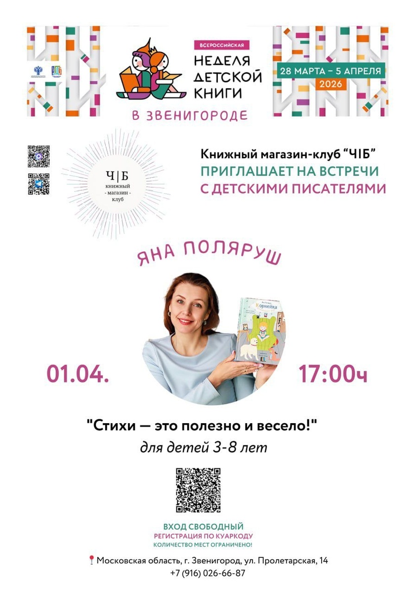 Звенигороде Книжный магазин-клуб Ч|Б приглашает вас на встречу с детским писателем Яной Поляруш Тема: "Стихи — это полезно и весело! " По своему сборнику стихов "Корнейка открывает мир" автор проведет интерактивную встречу с дошкольниками и младшими школьниками. Автор весело и увлекательно 😀 покажет и расскажет: ✅как пишутся стихи, ✅как их нужно читать, ✅в чем их польза и значение. Яна Поляруш помимо стихов для детей, пишет прозу для подростков и взрослых. Мама трёх сыновей! А также она сценарист и кинорежиссер. Вы могли видеть два ее полнометражных фильма "Видримасгор , или История моего космоса", "Со дна вершины". После встречи можно сфотографироваться с автором, купить книгу и получить автограф. 1 апреля в 17:00ч | Ср Продолжительность: 45 мин. 20 мест (свободны 17❗) Дети 3 — 8 лет Вход свободный! Но нужно ОФОРМИТЬ БИЛЕТ Всё весёлое в Ч|Б!😅📚 Наш канал в Max Книжный магазин-клуб Ч|Б 📍Московская область г. Звенигород ул. Пролетарская, 14 📞+7 (916) 026-66-87 #СтихиДетям