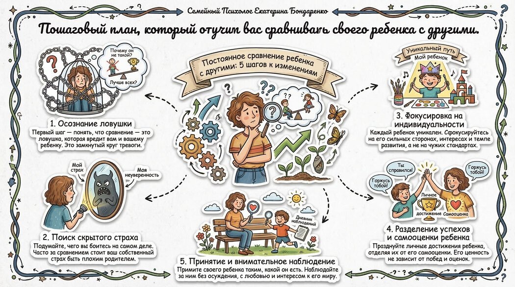 Родители приходят ко мне на консультацию, рассказывая: "Я ловлю себя на том, что постоянно оцениваю своего сына через других детей. Вот у подруги дочка уже читает, а мой всё еще буквы путает. На площадке все такие шустрые, а мой медлительный. Я понимаю, что это неправильно, но ничего не могу с собой поделать. После этого я злюсь на него, потом чувствую себя ужасной матерью, но в голове всё равно продолжается этот бесконечный марафон сравнений». В этой статье я покажу 5 простых шагов, которые превратят привычку сравнивать в умение видеть уникальность. Когда вы сравниваете, вы либо возвышаетесь в гордыне (если ваш ребенок лучше), либо впадаете в уныние (если он хуже). И то, и другое убивает любовь. Потому что любовь - это принятие, а сравнение - это оценка.Людмила Петрановская ШАГ 1: Осознание ловушки. На этом этапе клиент перестает отрицать проблему и признает, что сравнение стало навязчивым механизмом, который приносит боль и чувство вины. В терапии мы учимся отслеживать момент запуска