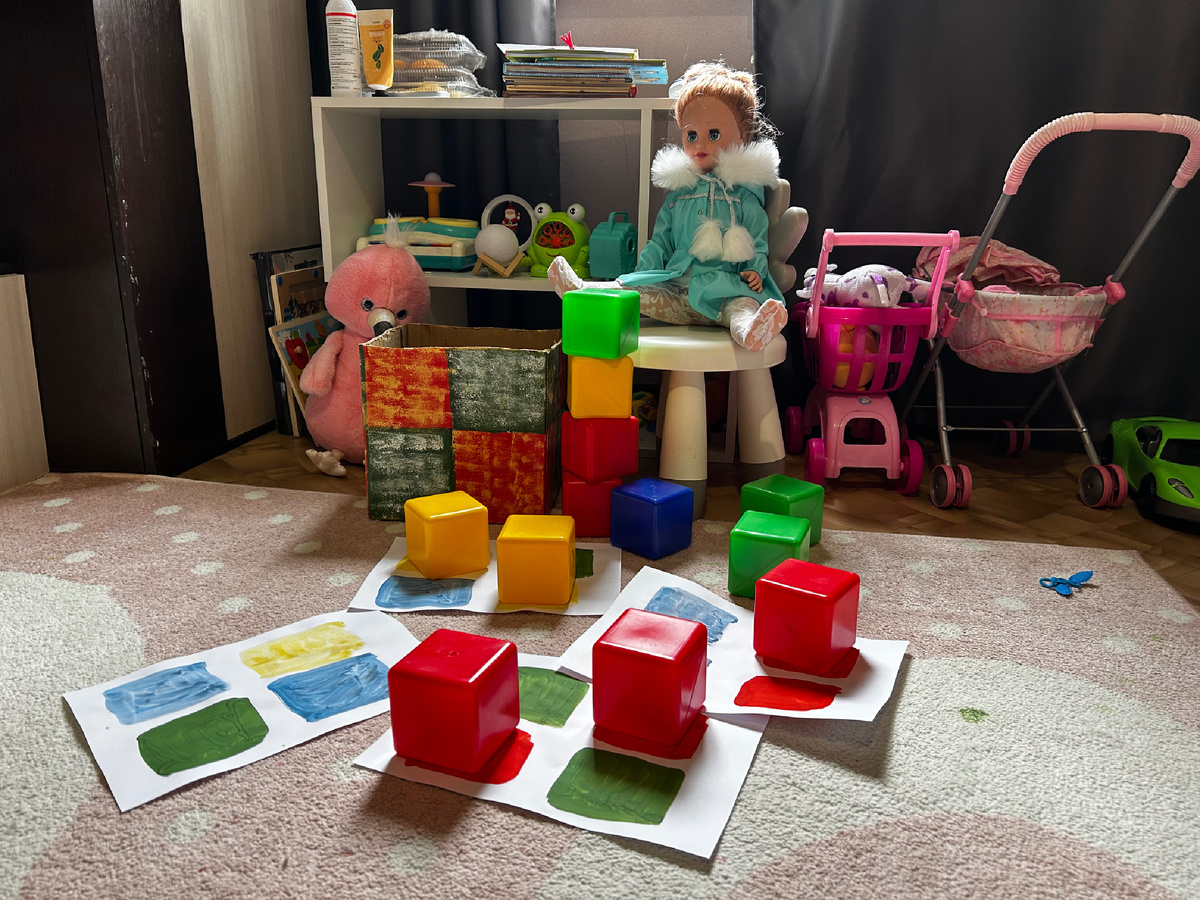 Задача малыша — методом сопоставления поставить каждый кубик на «свой домик».