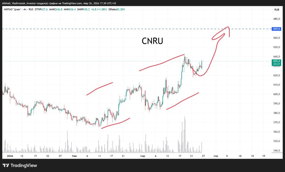 Прибыль ЦИАН за 12 месяцев увеличилась на 16,2% год к году и составила 2,9 млрд руб. - отчет Прогноз на 2026 год: ускорение роста выручки до 17%-22% Подтверждаем планы по выплате дивидендов в размере 50 рублей на акцию в 3 квартале 2026 года. В дополнение предусмотрена еще одна выплата дивиденда за 2026 год, о размерах и сроках которой проинформируем отдельно. Согласно нашей дивидендной политике, 60-100% от Скорректированной чистой прибыли по МСФО Компания стремится ежегодно направлять на дивиденды. Рост рентабельности по году позволит увеличивать размер этого дивиденда. — компания отчет По графику: Тренд восходящий, поэтому можно и дальше искать покупки на младших таймингах