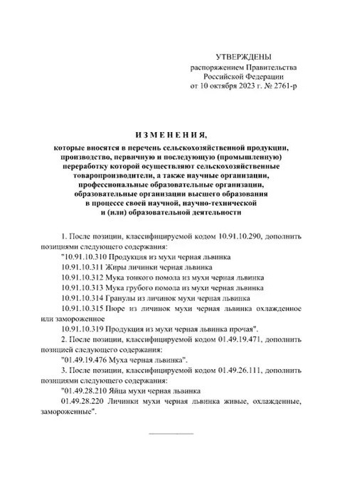 ? 💯Теперь в России в перечень сельскохозяйственной продукции внесены жиры, пюре и мука из мухи черная львинка и ее личинок. В октябре 2023 г. нововведение было закреплено специальным распоряжением о новом порядке разведения мух черная львинка, подписанные премьер-министром Мишустиным. Профессор РАН, заведующий отделением Федерального исследовательского центра животноводства Роман Некрасов говорит, что «принятие правительством постановления долгожданно и востребованно, оно позволит официально наладить производство и переработку сельскохозяйственными товаропроизводителями продуктов из личинок черной львинки. Это открывает возможности производства разнообразных продуктов из насекомых в больших масштабах, что укрепит кормовую базу страны». ‼️Так же насекомые становятся своеобразным мини-скотом, который можно выращивать для питания человека, напоминает Некрасов из РАН.