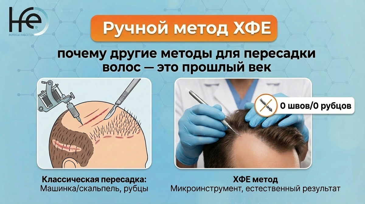 Трансплантация волос сегодня переживает новую эру, где на смену травматичным и малоэффективным технологиям приходит ювелирная точность. Миллионы людей, столкнувшихся с алопецией, до сих пор пребывают в плену устаревших стереотипов, представляя пересадку волос как болезненную операцию с длительной реабилитацией и неестественными результатами. Однако индустрия ушла далеко вперед, и лидером этого движения стал ручной метод ХФЕ (Hand Follicle Extraction). Это не просто эволюция, а настоящая революция в трансплантологии, делающая другие методы пересадки волос пережитком прошлого. Клиника ХФЕ — единственный в России официальный патентообладатель методики — возвращает густоту волос с приживаемостью до 98% и абсолютно без следов вмешательства.