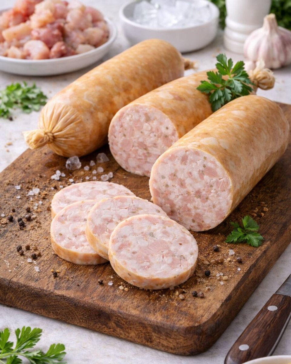 ) 👉🏻 Вам понадобится (на 1 кг фарша): • Куриное филе – 600 г • Куриные бёдра без кожи – 300 г • Куриный жир – 80 г • Лёд или ледяная вода – 120 г • Нитритная соль – 6 г • Соль поваренная – 10 г • Сахар – 3 г • Перец белый молотый – 1 г • Мускатный орех – 0.5 г • Чеснок сушёный – 2 г • Коллагеновая оболочка Ø 45 мм – 2–3 м Для вашего удобства, мы делимся ссылкой на нашу продукцию — оболочку Ø 45 мм, идеально подходящую для данного рецепта😋 WB: 19695793 OZ: 534765134 Готовим фарш 🧑🏼🍳 Филе и мясо бёдер нарезаем кубиками 2–3 см и охлаждаем до −2 °C. Половину филе измельчаем через решётку 3 мм, вторую часть и бёдра — через 6 мм для выраженной структуры. Соединяем мясо с нитритной и поваренной солью, сахаром и специями. Вымешиваем до появления белковых нитей и липкости, постепенно вводя лёд. Температура фарша не выше +12 °C❗️В конце вмешиваем мелко нарезанный жир. Выдерживаем 8–12 часов при +2…+4 °C. Набиваем оболочку 🥊 Оболочку замачиваем в тёплой воде 10 минут. Набиваем фаршем
