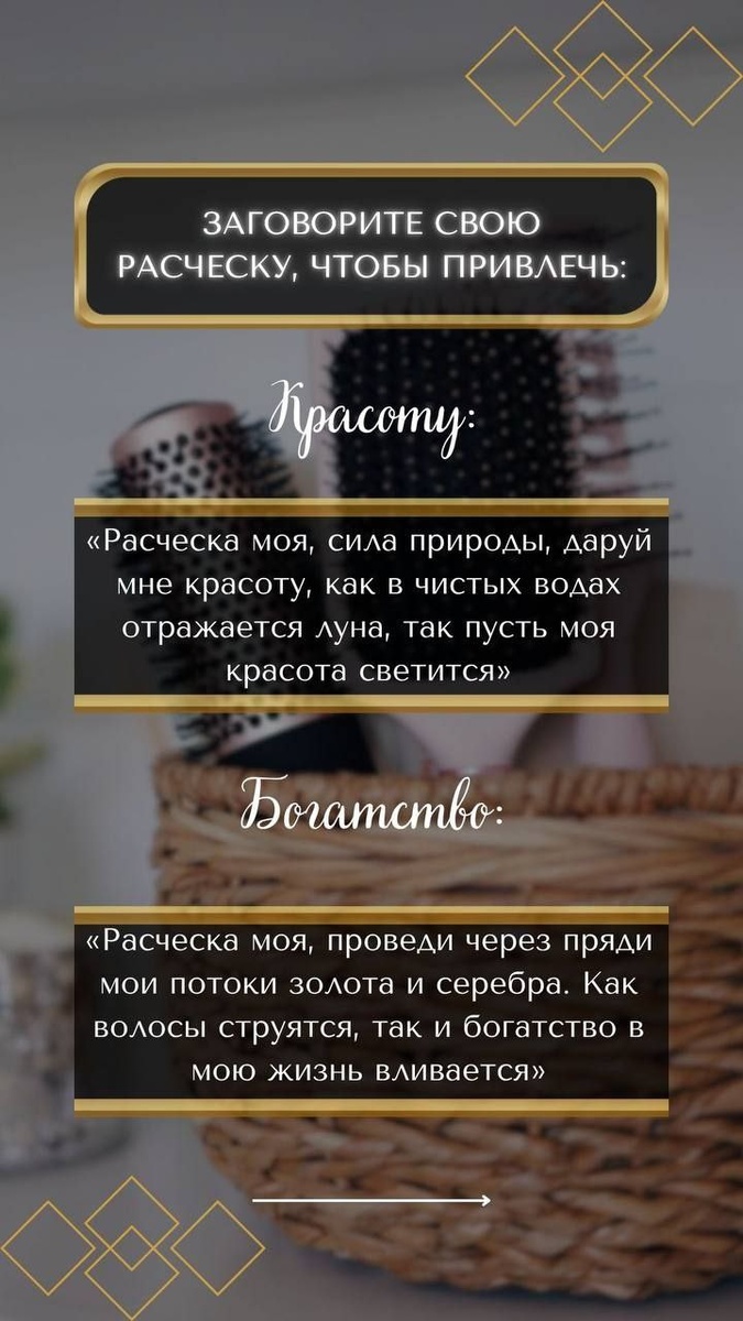 💋💋💋💋 💋Расческа, как зеркало, отражает наше внутреннее состояние. Растрепанные, спутанные волосы часто свидетельствуют о хаосе в мыслях, стрессе и эмоциональной нестабильности. 💋И наоборот, ухоженные, блестящие волосы – признак гармонии, уверенности в себе и внутренней силы. С древних времен волосы наделялись магическими свойствами. Они считались вместилищем жизненной энергии, связующим звеном с космосом и хранителями памяти. Поэтому ритуалы, связанные с расчёской всегда имели особое значение. 💋В разных культурах ритуал расчесывания волос оброс своими традициями и верованиями. 💋 Например, считалось, что расчесывание волос перед сном помогает избавиться от негативных мыслей и эмоций, накопившихся за день. 💋 Расчесывание волос в полнолуние, наоборот, привлекает удачу и усиливает интуицию. 💋 А расчесывание волос беременной женщины сулит ее будущему ребенку здоровье и счастье. Однако, чтобы расческа действительно стала магическим инструментом, необходимо соблюдать определе