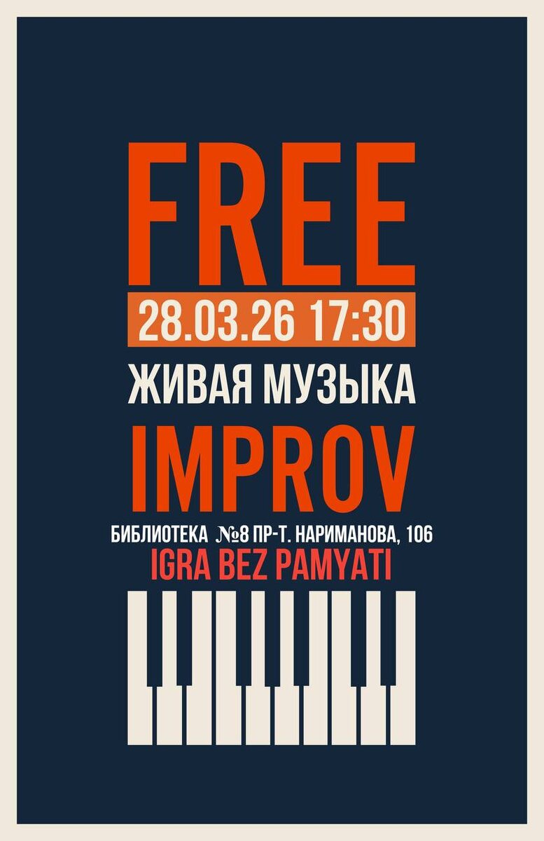 » 🎷 🗓️ 28 марта 17:30 📍 Библиотека №8, пр-т. Нариманова, 106 Что происходит, когда музыканты отказываются от партитуры и доверяются только мгновению? В этом жанре инструменты перестают быть просто инструментами — они становятся голосами, шумом, тишиной и эмоцией, рождающейся здесь и сейчас. Это не концерт в привычном понимании. Это диалог без сценария, где каждый звук уникален и никогда не повторится. Для неподготовленного слушателя это возможность перезагрузить восприятие музыки; для искушенного — встреча с подлинным искусством настоящего момента. 🏷️ свободный вход* *количество мест ограничено. Рекомендуется не опаздывать, чтобы не нарушить хрупкую звуковую материю) #28марта26@culturnik 🕊️пойду • ❤️ нравится • ✅рекомендую