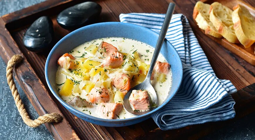 Ингредиенты 300 г филе свежей семги или форели 500 г картофеля 300 г помидоров лук порей или репчатый (1 луковица) 150 г моркови 500 мл сливок (10–20%) плавленный сырок ("Дружба") соль растительное масло зелень по вкусу Приготовление Лук мелко покрошить. Морковь натереть на мелкой терке. Картофель почистить, нарезать небольшими кубиками или брусочками. Семгу и плавленный сырок нарезать небольшими кусочками. Помидоры очистить от кожицы (чтобы кожица снялась легче, можно помидоры опустить на несколько секунд в кипяток), нарезать кубиками. В кастрюле, на растительном масле обжарить лук. Добавить морковь, обжарить. Добавить помидоры, слегка обжарить. Затем налить 1 литр воды, довести до кипения. Когда вода закипит, добавить картофель, немного посолить. Варить до готовности картофеля. Затем перетереть все в кастрюле (Можно в блендере) толкушкой для приготовления пюре. Затем добавить семгу и очень мелко нарезанный плавленный сырок. Очень вкусно добавить немного красной икры или немного оч