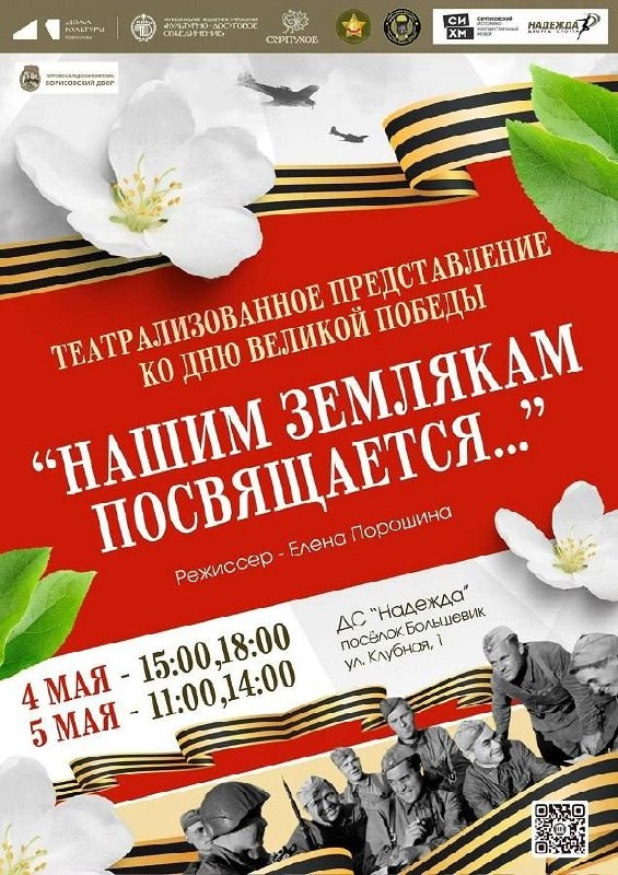 81-й годовщине Великой Победы посвящается! Московская область, г.о. Серпухов, Дворец спорта «Надежда» 04.05.2026 г. — 15:00 и 18:00 05.05.2026 г. — 11:00 и 14:00 Театрализованное представление «Нашим землякам посвящается» — глубокая дань уважения павшим землякам Подмосковья, отдавшим жизнь за Отечество. Боль и вечная память. Победа в Великой Отечественной войне — неугасимая звезда на небосклоне Родины. Вход свободный по пригласительным (бронирование): 4 мая — 15.00 https://biletof.com/action/?ra=19068&frame=1&action=11163&place=502 4 мая — 18.00 https://biletof.com/action/?ra=19069&frame=1&action=11163&place=502 5 мая — 11.00 https://biletof.com/action/?ra=19070&frame=1&action=11163&place=502 5 мая — 14.00 https://biletof.com/action/?ra=19071&frame=1&action=11164&place=502