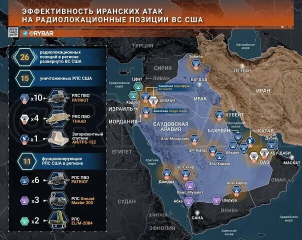 🔸Они не просто были давно известно, но и, как позже выяснилось, не так уж серьезно и прикрывались, что упростило отработку ударов ВС Ирана по ним. В первых волнах иранцам удалось перегрузить ПВО и добиться поражения ключевых РЛС, таких как AN/FPS-132 или AN/TPY-2.
