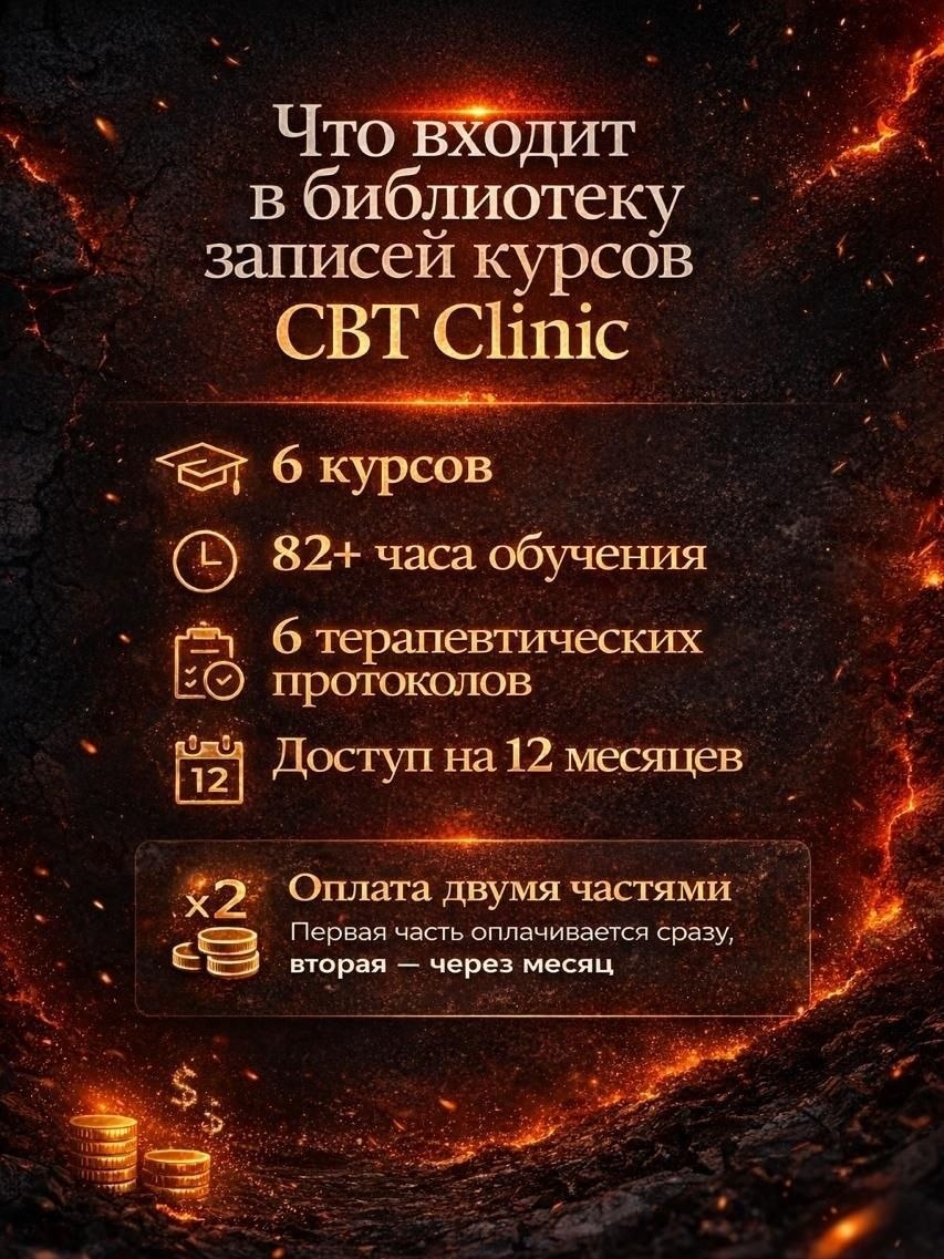 Сейчас мы открыли к ним отдельный доступ на ограниченное время 📚 В библиотеку входят курсы по: — терапии ПТСР и комплексной травмы — CTR (работа с тяжёлыми состояниями) — терапии зависимого поведения — КПТ перфекционизма — работе с булимией и перееданием — клинической сексологии 📝 Всего: 6 курсов 82+ часа обучения 6 терапевтических протоколов доступ на 12 месяцев Это не обзорные лекции. 🎓 В курсах разобраны: логика концептуализации случая структура терапии шаг за шагом выбор интервенций типичные сложности работы специалиста К библиотеке можно возвращаться в любой момент в течение года — под конкретные задачи практики. Сейчас любой пакет библиотеки можно оплатить двумя частями Первая часть оплачивается сразу, вторая — через месяц. Эта возможность доступна прямо в платёжной форме после перехода к оплате. Посмотреть состав библиотеки: https://cbtclinic.education/cbtclinicarchive Завтра последний день, когда можно приобрести доступ. 📌 После закрытия окна продаж библиотека