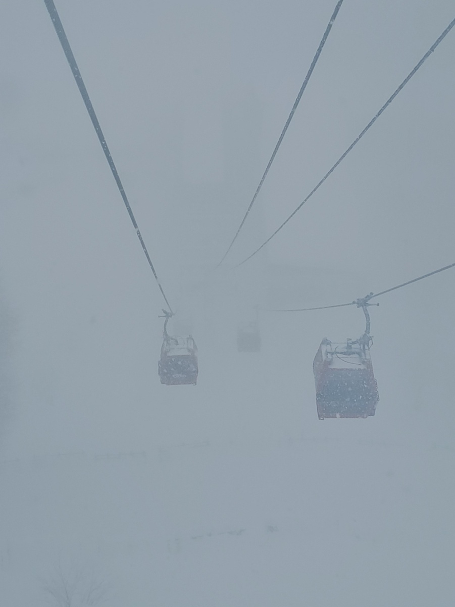 Кабинка поскрипывала от тяжести снега на ней. А пейзажи вокруг были фантастические, ну те, которые я смогла разглядеть сквозь снегопад и туман.