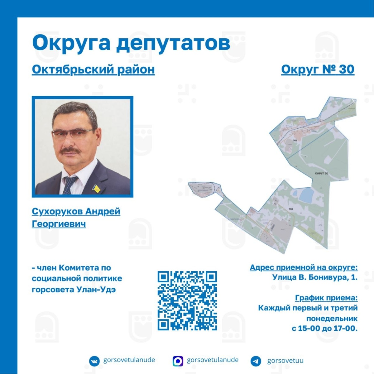 🔷️Избирательный округ №30 🔹️Завершает нашу рубрику округ №30, который занимает восточную часть Октябрьского района Улан-Удэ. Здесь расположены микрорайоны Сосновый бор и Звездный, чью территорию преимущественно занимают воинские части. 🔹️Депутатом округа является Андрей Георгиевич Сухоруков, член Комитета по социальной политике Улан-Удэнского городского Совета депутатов. Андрея Георгиевича можно назвать одним из старожилов горсовета Улан-Удэ, для него это уже третий созыв. 🔹️Так как округ специфичен по своей территории, здесь и вопросы, касающиеся благоустройства или жилищно-коммунальной инфраструктуры, требуют особой проработки. 📍Адрес приемной на округе: Улица В. Бонивура, 1. 🗓График приема: Каждый первый и третий понедельник с 15-00 до 17-00 🔎Подробнее о том, какие микрорайоны, улицы, переулки и проезды входят в границы округа №30 - в нашем канале в MAX 👇 https://max.ru/gorsovetulanude/AZ0pLONGSE0 ➡️ Горсовет Улан-Удэ в MAX | Telegram | ВК | ОК