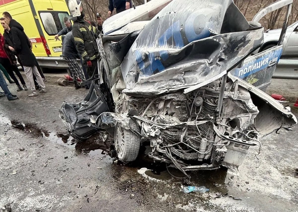 Патрульный Toyota Crown загорелся после столкновения с большегрузом во время погони — пробка на трассе «Уссури» растянулась на километры. По предварительным данным, экипаж дорожно-патрульной службы преследовал мотоциклиста. При попытке остановить нарушителя автомобиль — чёрный Toyota Crown, долгое время работавший в Тавричанке, — врезался в фуру. От мощного удара легковушку отбросило в леера. «Патрульная машина гналась за байкером. В районе поворота на Тавричанку она влетела в многотонник — удар был такой силы, что автомобиль сразу загорелся. Проезда нет, образовалась серьёзная пробка в сторону города», — рассказали подробности случившегося очевидцы происшествия. На место оперативно прибыли бригады скорой помощи и пожарные расчёты. Возгорание ликвидировали. Медики оказали помощь двум сотрудникам Госавтоинспекции по Надеждинскому району, пострадавшим в аварии, и доставили их в больницу. Детали состояния мужчин не раскрывают. В пресс-службе полиции Приморского края сообщили, что води